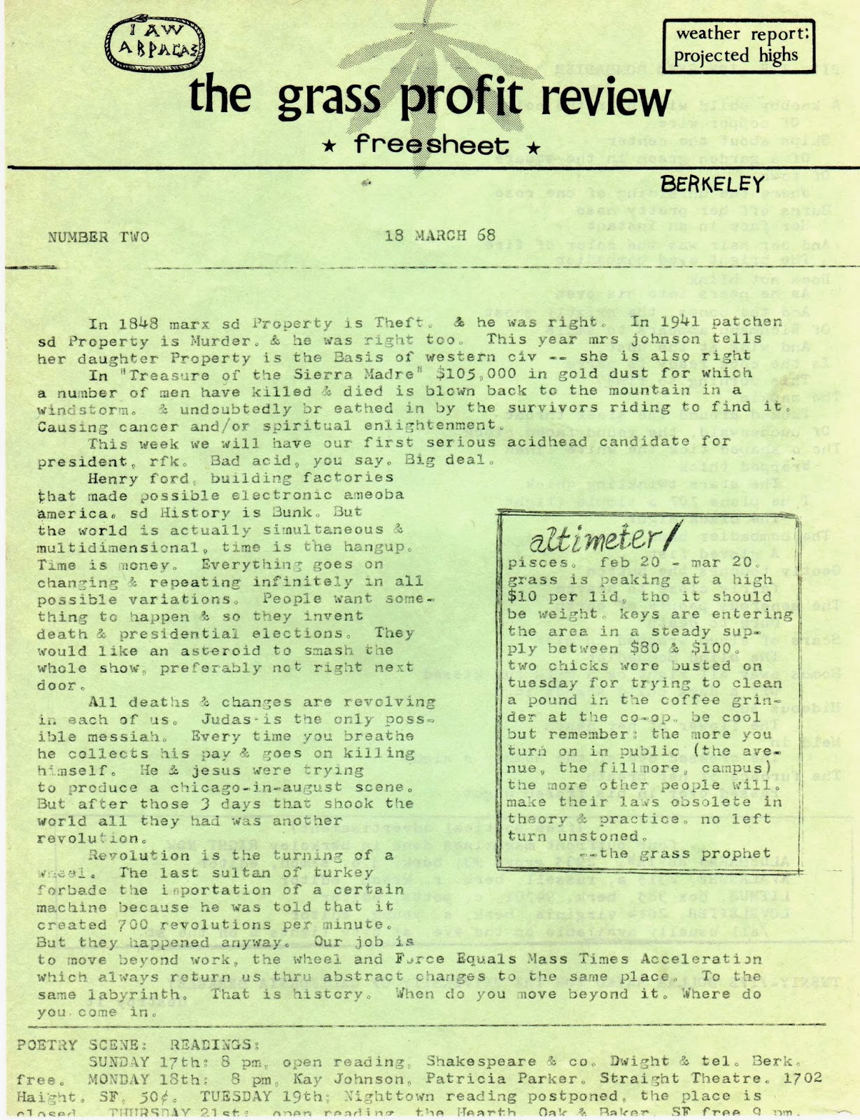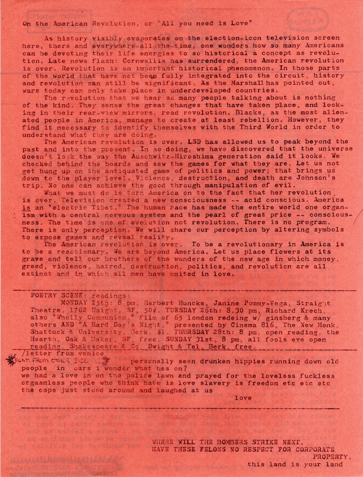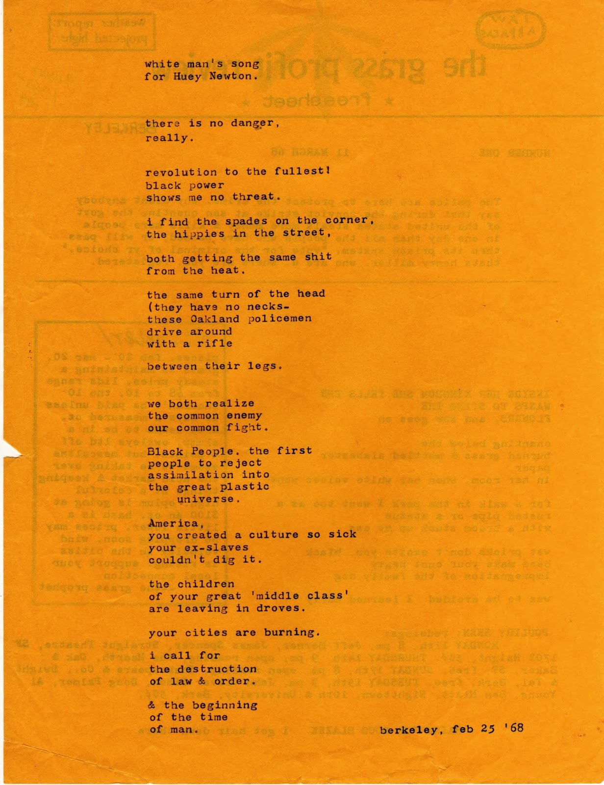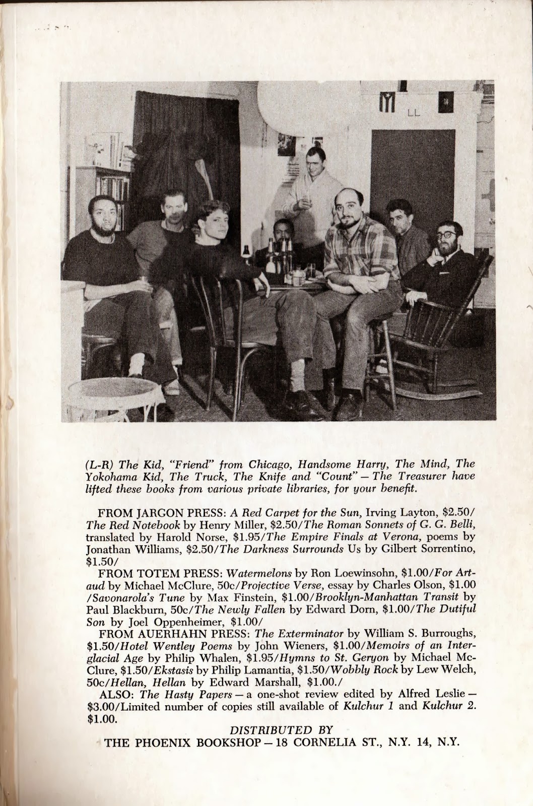 The labels of hot and cold are merely a re-stating of Lowell’s famed raw and the cooked. Thorne’s third choice includes in large part the poets of the Meat School. Working class poets, like Blazek, Richmond, and Wantling, as well as the poets of the Rust Belt like levy and John Sinclair. The primary example, the unnamed one that Thorne describes, is Charles Bukowski. Epos published Buk’s poems and drawings in 1962. Bukowski symbolized and led the third classification as outlined by Thorne that was missing from the discussion of little mags in Carleton Miscellany in 1966 and remained in the shadows in 1998 in Secret Location. There are hundreds of magazines and small presses, like Epos, which were the meat and potatoes, the lunch pail laborers, of the Mimeo Revolution that, to this day, remain largely undocumented and under-appreciated. Thorne lays it out as well as I have seen it done. Epos knew from experience.JB