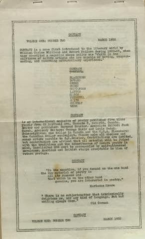 It is our idea that the writers whom we share with a number of other magazines move largely within this large classification, as do the writers whom we share with fewer magazines. It is these less-shared writers who chiefly concern us. They are not being adequately presented in the poetry journals that limit themselves by rigid editorial policies. Perhaps I will be pardoned an example. We know a writer (he is just past 40) whose output is tremendous. He has some nine full book-length manuscripts of poems. There are beautifully structured manuscripts and the poems are thoroughly modern in subject and treatment, excellent work, and, we think, important. Only a ridiculously small number of these poems have been published. Not enough to give readers the flavor of his strong brew. Why? Because he frightens the traditionalists (and by tradition I refer not only to form but to thought) and he puzzles the outsiders, for he is very much in our society, a working, though often a protesting, part of it.